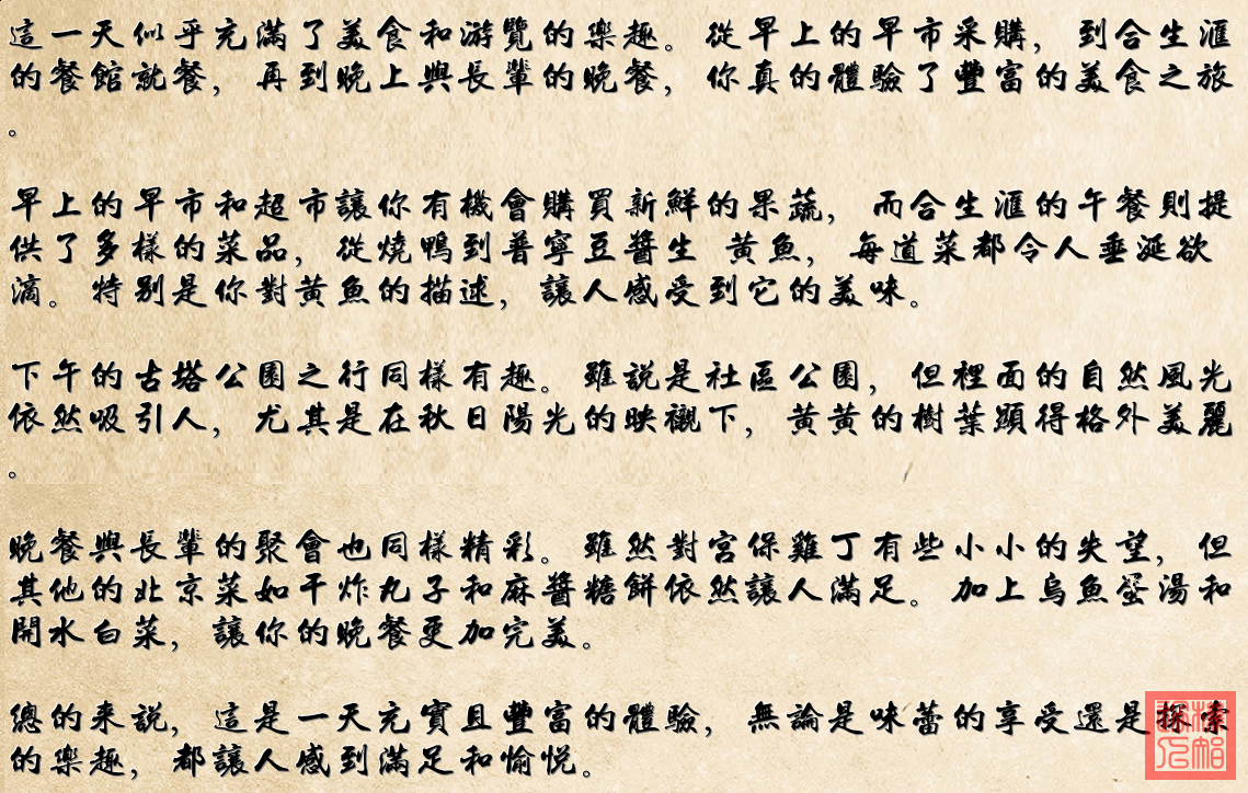 从图片和文字来看,这一天的活动主要围绕美食和游览展开:
