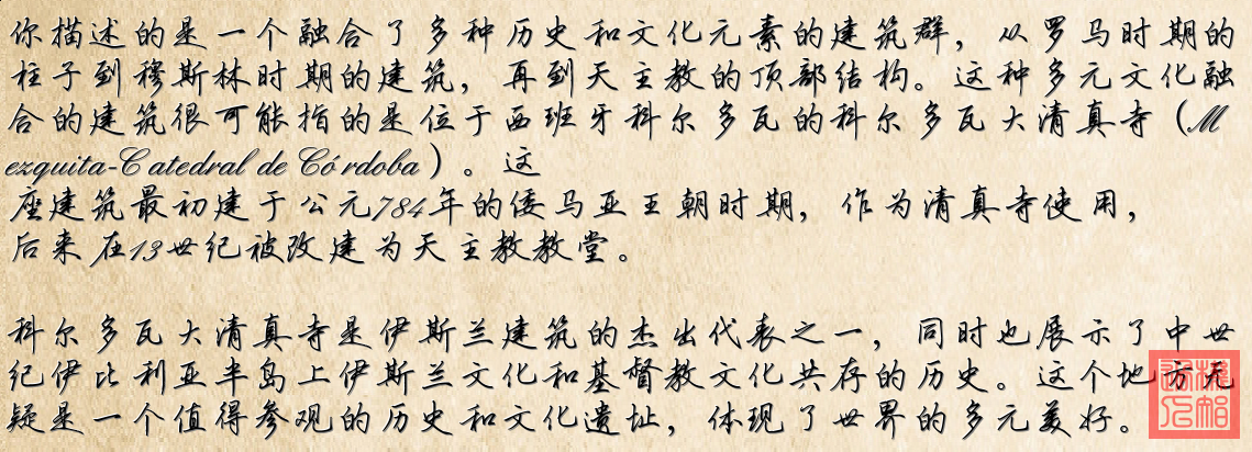1. **底部是罗马时代的柱子,中间是穆斯林,上部是天主教**:这可能暗示了一个融合多种文化和历史层次的建筑,可能是出现在西班牙的地方,例如安达卢西亚地区。
