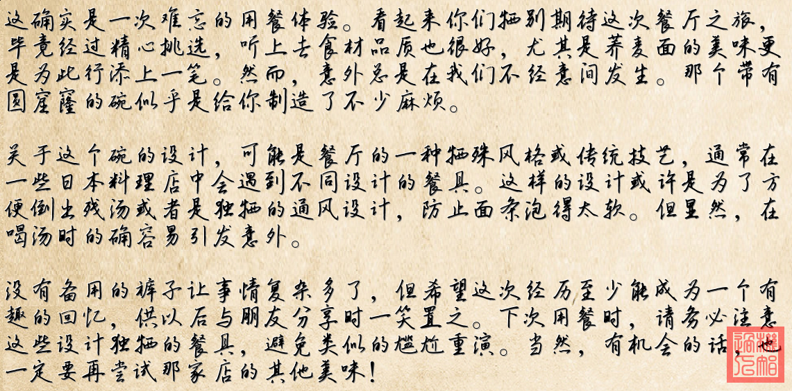 5. **汤碗的窟窿困扰**:最后一张图片可以看到汤碗上有一个圆形开孔。文中提到这个开孔导致汤洒到了裤子上,引发了用餐时的小尴尬。