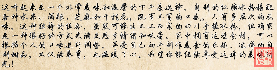 1. **自制红糖冰粉**:图片中的红糖冰粉使用了多种水果,如蓝莓、草莓和桃子,配以酒酿、芝麻和干桂花,色彩丰富,看起来非常美味。尽管与四川的传统手搓冰粉不同,但也能一解思乡之情。