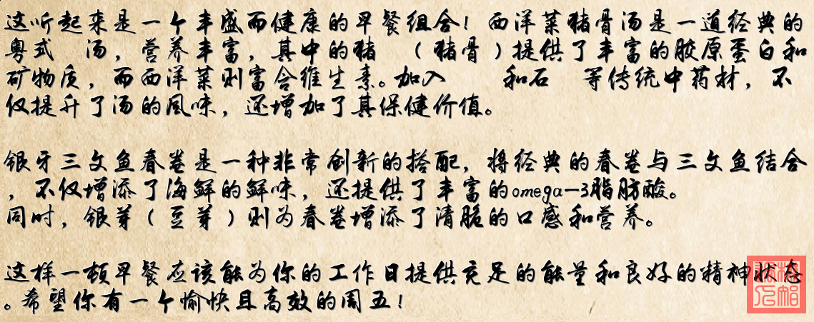 《晨光里的烟火》 晨光爬上厨房窗台 银牙三文鱼在春卷里醒来 豆芽轻脆 鱼肉洁白 金黄外衣裹着海的味道 砂锅咕嘟整夜未眠 枸杞在汤里转着圈圈 陈皮飘香 石斛沉底 胡萝卜染红满室清甜 西洋菜跳进晨雾里 猪踭化作云朵般柔软 汤勺搅动 香气盘旋 像母亲的手抚过碗沿 周五的列车就要启程 带着满腹温暖启程 食盒里装着整个春天 办公桌上会长出花园 城市在玻璃窗外流动 胃里住着小小的太阳 咬一口春卷喝一勺汤 这就是生活该有的模样