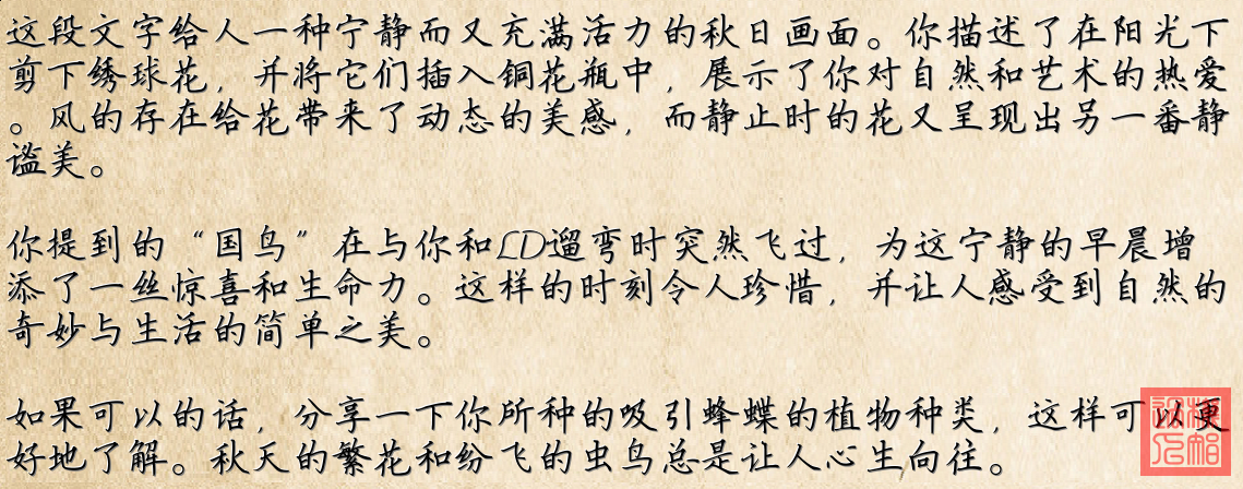 1. **枯黄的绣球花**:图片中展示了一簇自然枯黄的绣球花,反映了秋天落叶的景象。