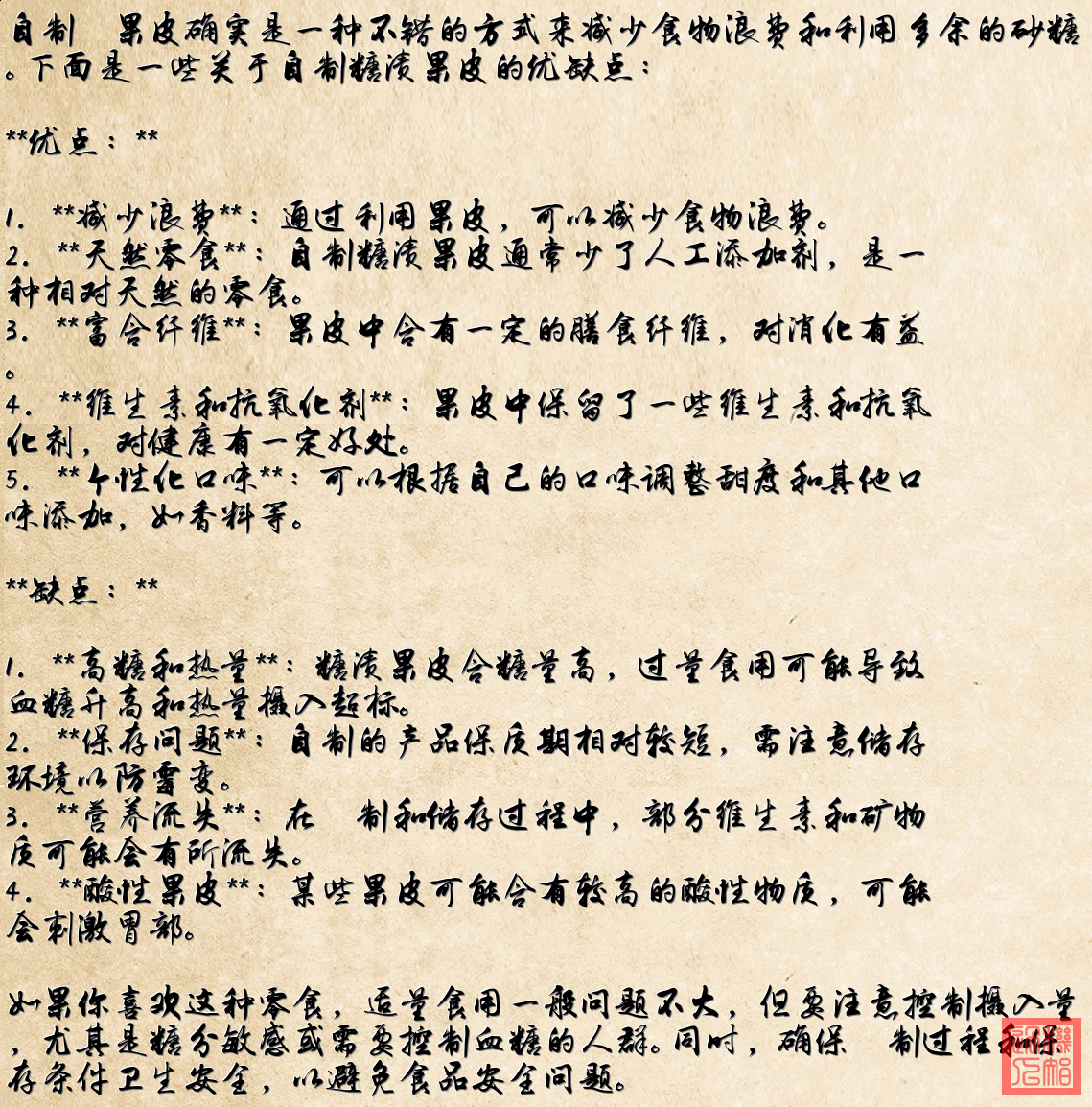 自制腌制果皮是一种有趣的尝试,以下是一些可能的利弊: