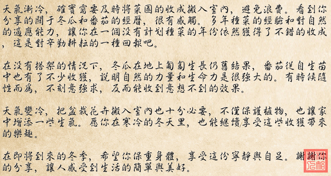 总体来看,这些图片和文字记录了一个业余菜农在深秋天气变冷前如何处理最后的蔬菜收成,以及一些关于园艺工作的心得体会。这是他们经过多年的种植经验,对种植园进行整理和未来计划的总结。