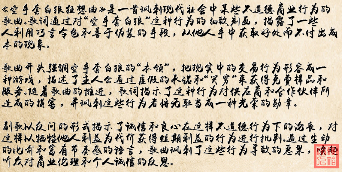 《空手套白狼协奏曲》 你说空手摘星辰才是真本领 九次打样三万块化作青烟去 对采购商哭穷是祖传的绝技 凌晨三点回复算他修来的福气 设计图发来你说呼吸要暂停 完美得像盗取天火的第一人 刻薄的舌突然裹满糖衣 半年换三厂如弃破旧收音机 啊~精湛的空手艺术家 把欺诈当绶带佩在西装下 骗来的模型垒成巴比塔 偏自称是火箭的螺丝钉呀 (螺丝钉在契约沼泽里腐化) 上个工厂给航天局缝过纱 八个月血肉代价喂了碎纸机 你耸耸肩说不如街边棉花糖 新目标在流水线为你着了迷 明天快递就要叩响你门庭 抚摸战利品该多么动情 谎言的雪球在夏日翻滚 反正灵魂签了卖身契 当你清点零成本的战绩 可听见诺言在打印机里哭泣? 当你展览白嫖的工艺 可知火箭正坠落在你酒杯里? (电话彩铃响起) “您好我是新供应商 听说您专收梦想样品…” 你优雅地展开狩猎笔记 在诚信废墟上跳起华尔兹舞曲
