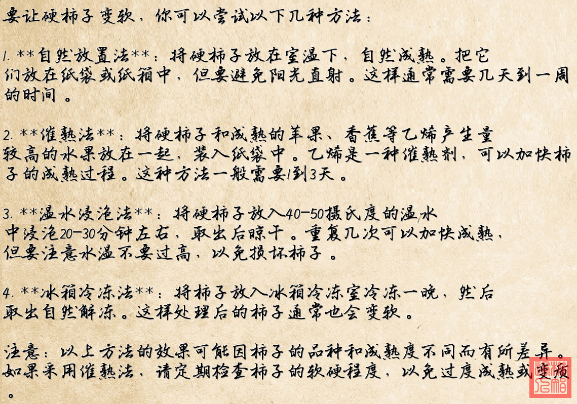 通过以上方法,柿子在几天内就可以变软,更适合食用。