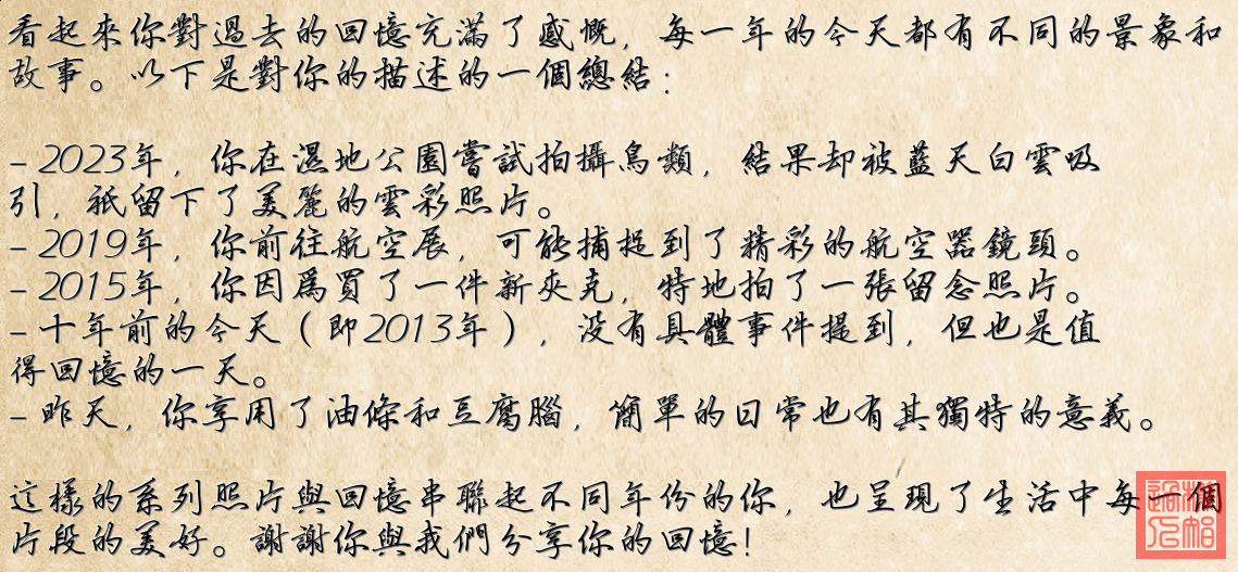 这些照片记录了不同年份的同一天里个人经历的不同事件,从风景照片到个人留影,再到日常生活中的吃饭时光,展示出作者对生活的点滴记录。