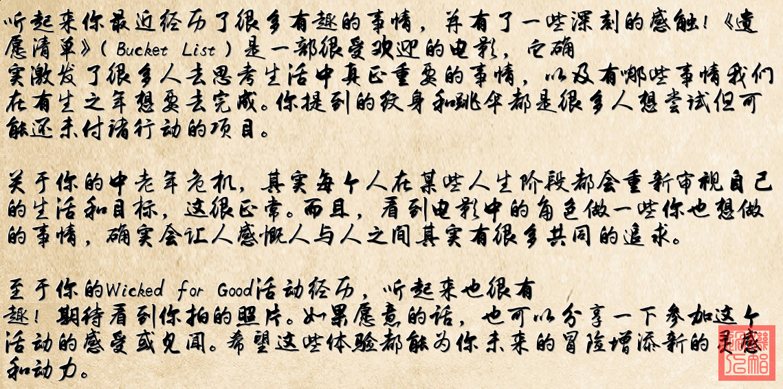 这样的活动和电影都能让人反思人生,激发我们去实现那些一直以来想要尝试的事。期待你整理后的想法!
