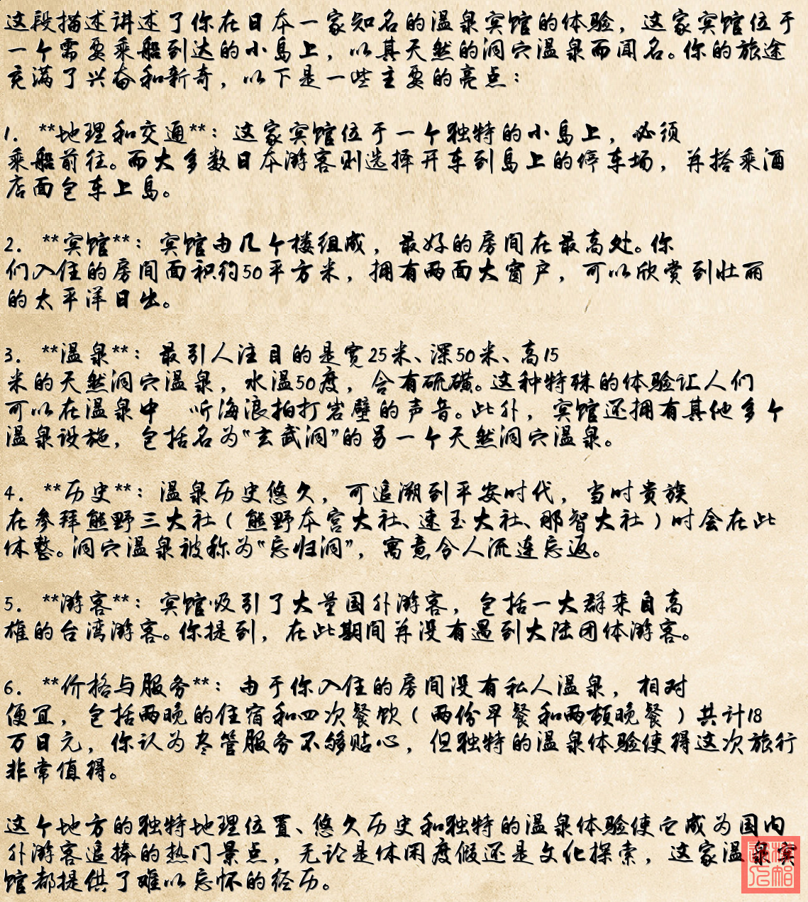 这些图片共同展示了这家一岛一宾馆的独特之处,主要集中在其天然温泉资源和优美的景观上。这些因素都使得该宾馆即使在交通不便的情况下也吸引了大量游客。