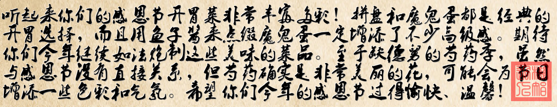 《感恩节厨房手记》 案板铺开斑斓画卷 稚嫩小手排列星点 萨拉米卷成玫瑰瓣 奶酪块垒出小雪山 石榴籽在瓷盘迸溅 葡萄串垂落紫水晶链 那个梨子长出尾巴 变成骄傲的火鸡少年 蛋黄酱在勺尖旋转 裱花袋挤出云朵形状 鲟鱼子轻轻跳个圆舞 在蛋白船里微微发亮 芍药在窗台舒展裙摆 晨光给花瓣镀上蜜糖 缺德舅的纸袋还靠在墙角 飘来十一月特有的芬芳 烤箱计时器叮咚作响 肉桂香气爬上玻璃窗 那些笨拙又真诚的摆盘 比任何大餐都值得珍藏