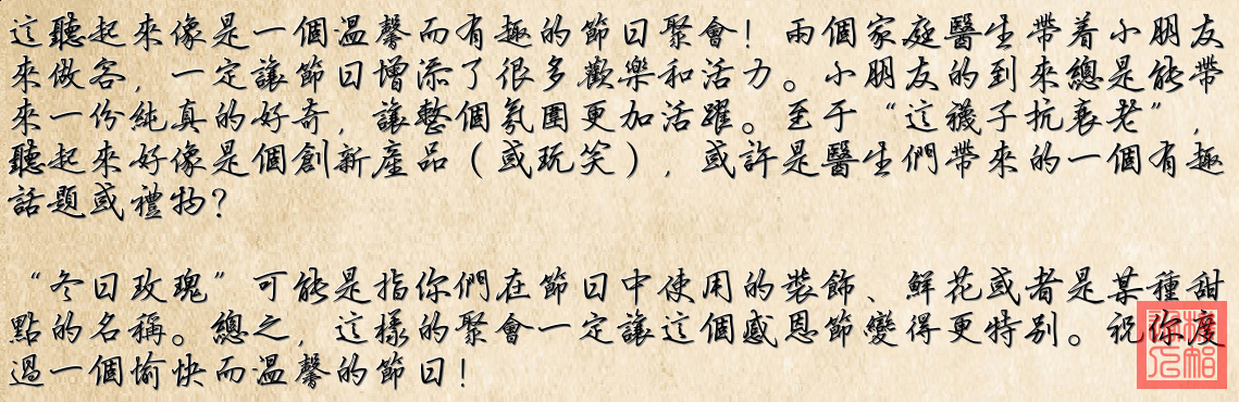 其中,“两个家庭医生来过节”的内容没有直接反映在具体图片中,这是环境背景的一个交代,而“Happy Thanksgiving!”也只是提到了节日的氛围,这些元素和图片一起形成了完整的节日场景。
