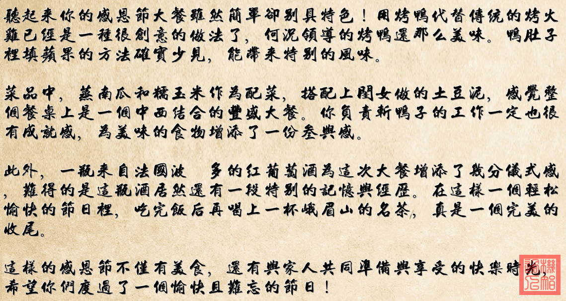 《感恩节厨房诗》 刀锋划过焦糖色脆皮 油珠在砧板跳华尔兹 苹果在鸭腹里酝酿秘密 烤箱传来秋天的密语 蒸笼升起白雾的帷幕 南瓜与玉米相拥而眠 土豆在女儿掌心融化 变成云朵落在青花瓷盘 波尔多红酒旋出涟漪 映着三年前归国行李 妹夫的笑容沉在瓶底 化作今夜满屋果香起 茶汤舒展成峨眉山色 冲散唇齿间最后油腻 你说这苹果浸透鸭油 像不像生活意外惊喜 我低头擦拭斩鸭刀锋 砧板纹路里藏着年轮 原来所有精心的安排 都是爱具象化的化身
