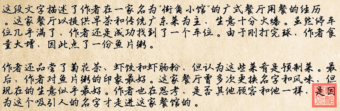 《街角小馆》 霓虹招牌在转角闪烁 热雾缭绕的广式烟火 停车位只剩最后承诺 打完球的我推门而入 青花瓷壶泡开菊花香 蒸笼叠起晶莹的月光 肠粉裹着南国的潮浪 白粥里游着片片鱼浪 多少名姓在门楣流转 唯有此刻座无虚席 是否你也因三字驻足 在寻常街角遇见惊喜 虾仁在薄纱里若隐若现 葱花在粥面写就诗篇 老饕与新客隔桌相望 共享这方寸人间 当茶香漫过午后时光 忽然懂得名字的重量 最简单的笔画最难忘 像这碗温热抚平饥肠