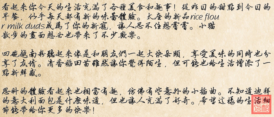 晨光洒落核桃派香气 昨夜甜梦化作盘中蜜意 奶油勾勒晨昏交界线 鸡蛋在瓷盘写早安序曲 米粉团子滚着糖霜起舞 太座的新作甜透眼底 糖浆沿着勺边滴落 恰似你笑涡荡漾的涟漪 猫咪踏过地毯的经纬 肉丸在汤碗游成四月的鱼 九层塔轻吻牛肉的纹理 越南河粉飘着异乡烟雨 黑板菜单写满陌生字符 香料在舌尖翻译成诗句 狮子玩偶挨着福字枕头 火气都化作童趣的旋律 迪拜揉进意式面包褶皱 巧克力熔岩裹着月光私语 生活本是散落的拼图 每片都藏着温暖的秘密