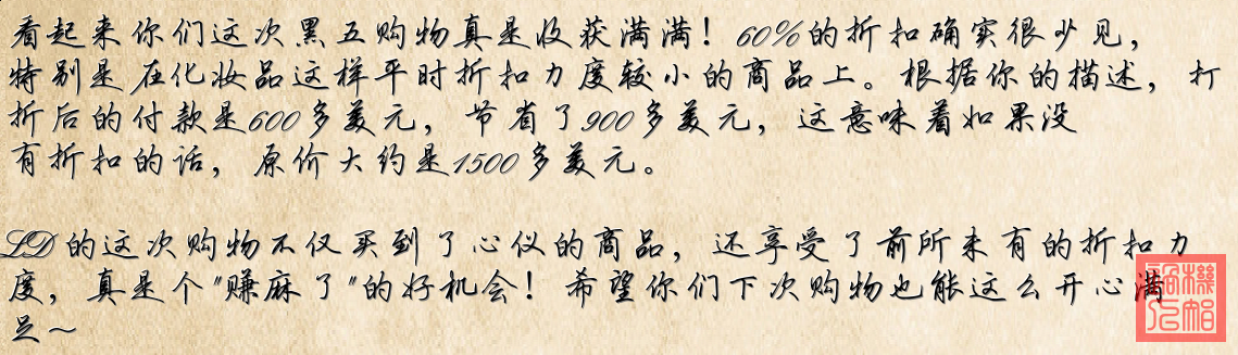总之,这是一个非常成功的购物日,享受到了大规模折扣带来的实惠。