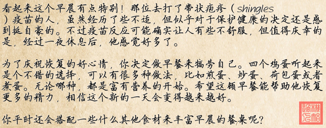 从文字描述中可以了解到,某人昨天去打了带状疱疹疫苗(shingles vaccine),并获得了一张药房的优惠券。不过晚上他感到不适,怀疑是疫苗反应,不过早上情况有所好转。另一人则为他准备了这份美味的早餐。