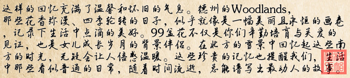 《九十九个春天》 北方的雪落满窗沿 忽然想起南方的庭院 那年风很暖 花不知疲倦 在德州的阳光下开成一片海 岳父数着清晨的台阶 一盆两盆三盆排到篱笆边 九十九个陶罐盛着九十九个季节 我们竟把岁月种成了圆 女儿在花影里转圈 从及膝高到触碰屋檐 三角梅攀过十年光阴的屋檐 茉莉的香气漫过秋千 第九十九盆是未完成的诗篇 结着青桃 垂着藤蔓 照片里那只黄狗还在打盹 树影摇晃着南方的午眠 北风翻阅泛黄的相片 九十九个春天在指尖蔓延 雪落时我听见花开的声响 从南方庭院到北方窗前