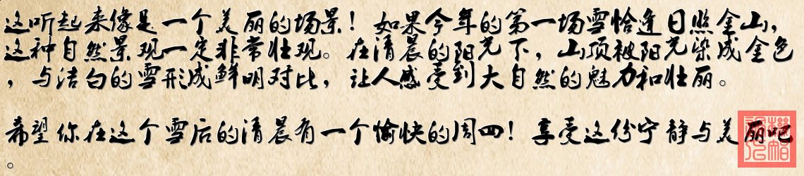 恭喜获得15点赞,更多点赞在路上。这张图片展示了一个雪后的清晨景象。远处的山被阳光