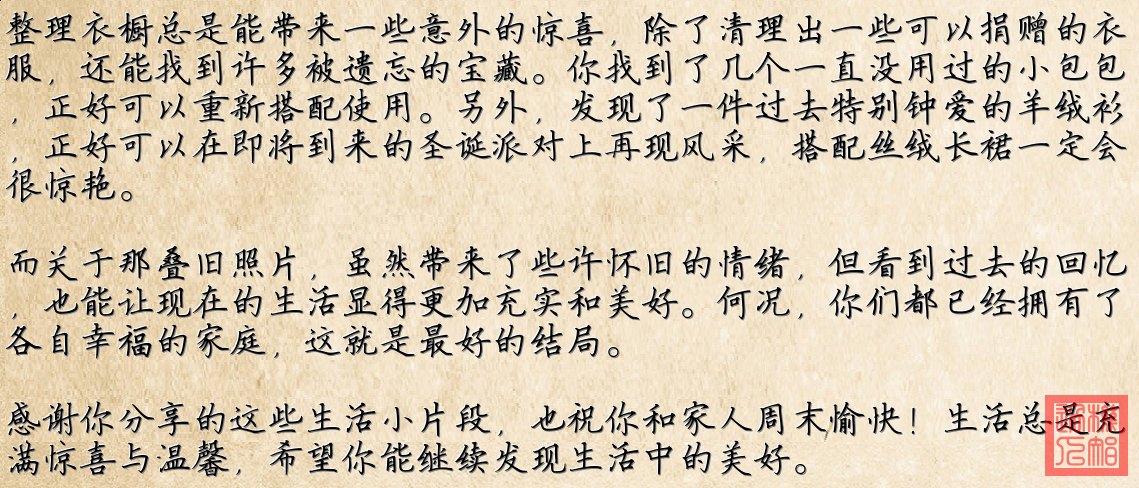 这些图片主要展示了家庭生活的片段,以及从整理衣橱中带来的惊喜发现。每张图片都有其独特的情感和意义,无特殊“新闻”事件。