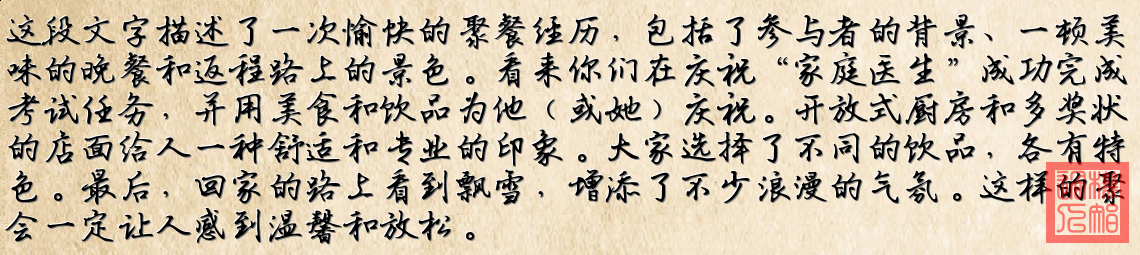 《雪夜串香》 墙上的奖状在暖光里排队 像时间的勋章闪闪发亮 开放式厨房飘出滋滋作响的乐章 酒架上琥珀色的梦轻轻摇晃 大米啤酒泛起麦芽的波浪 蜜蜂的膝盖藏着花的甜香 淘金热在杯中闪烁微光 三只酒杯碰响今夜的欢畅 炸鸡块穿着金黄蓬松的衣裳 柠檬角在盘边眯着眼睛张望 油锅里跃起酥脆的月亮 酱料碟盛着琥珀色的夕阳 竹签串起四季的好时光 青椒红椒依偎着牛肉的醇香 蘑菇撑着小伞排队成行 孜然粒在炭火里跳起圆舞曲 镜头定格三张带笑的脸庞 背景里火焰还在铁板上歌唱 走出门时路灯忽然变亮 雪花提着裙摆开始漫天飞扬 车轮碾过发光的车道 像驶进洒满糖霜的蛋糕 考卷折叠成远去的纸飞机 明天白大褂会记得今夜的味道 雪片亲吻车窗说着悄悄话 后视镜里餐厅渐成暖黄光点 这场冬日限定的狂欢节啊 把疲惫泡进冒泡的啤酒花 此刻我们是被串起的星辰 在人间烟火里短暂停靠 让孜然香飘进往后的年岁 每当雪花落肩头就会微笑