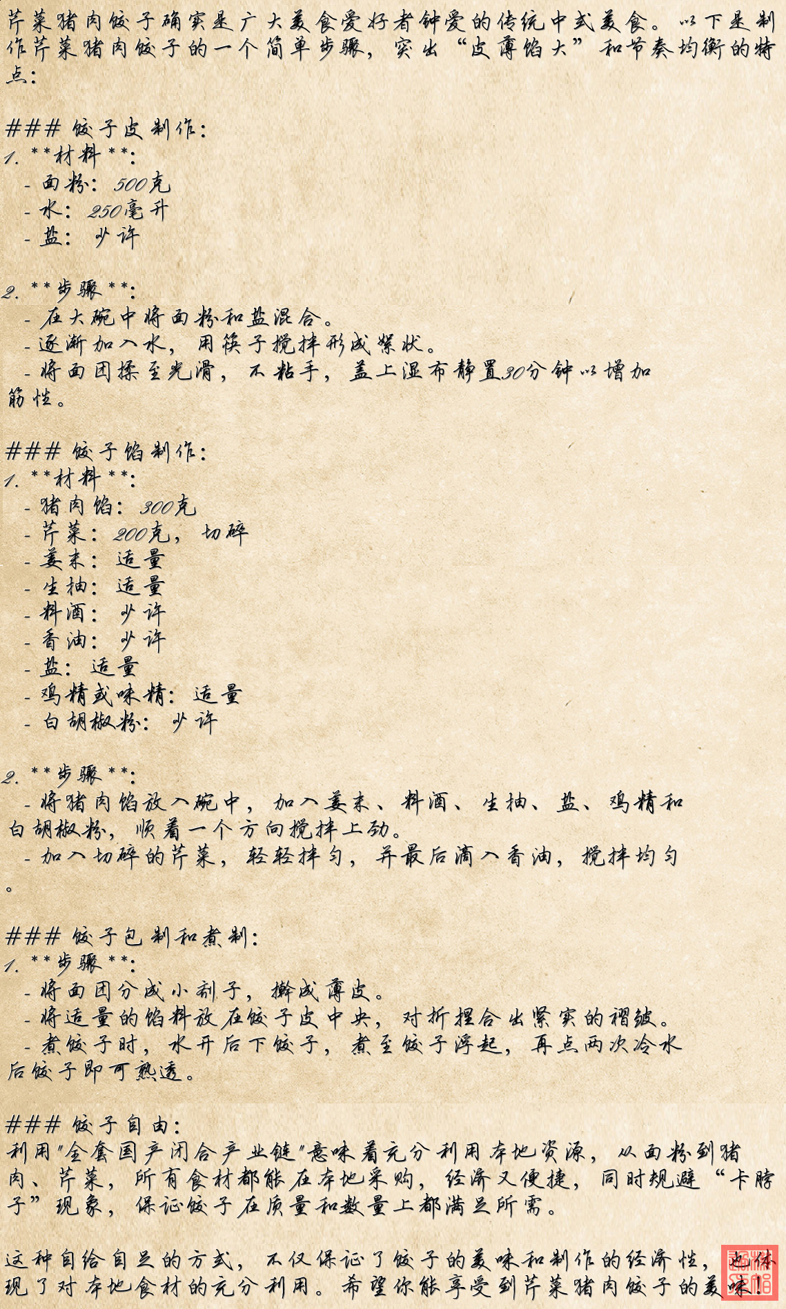 3. **馅料准备**:猪肉和芹菜混合在一起,成为饺子的馅料。