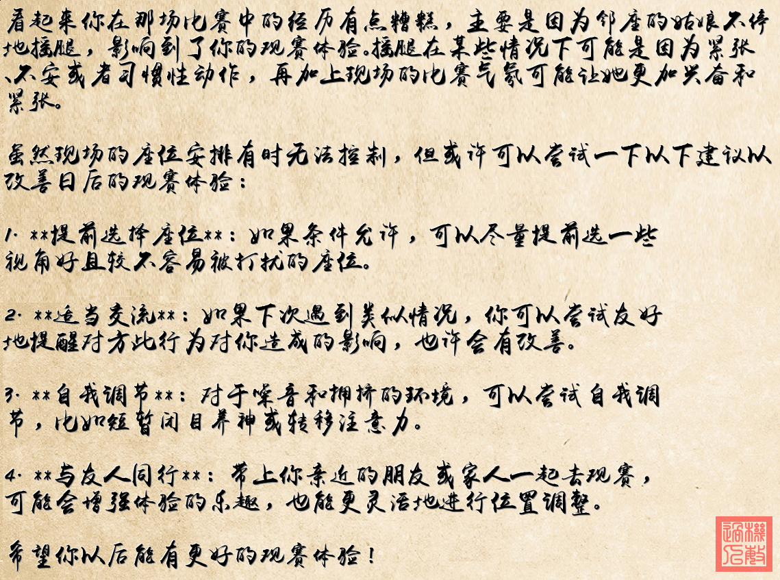 在这段文字中,你提到了在NBA比赛中遇到的小故事。你坐在一个神经紧张的姑娘旁边,她持续摇腿导致你的座位晃动,影响了观赛的心情。最后你选择换座位,虽然感到舒适了,但似乎运气也随之不再,球队输了比赛。