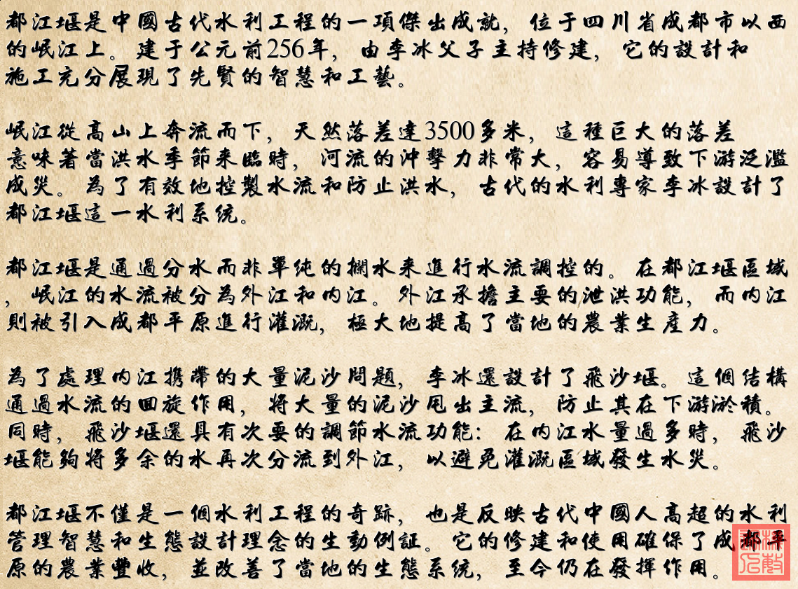 《悬河谣》 岷山雪化银龙醒,三千尺落悬天镜 劈开群峰向灌口,万顷怒涛撞地鸣 李公举火焚山骨,冷雨浇岩裂痕生 千军挥镐分江去,一道归田一道行 内江九转抱沙沉,回漩堰上浪花轻 若逢秋水拍堤急,飞沙漫卷送外汀 外江赶路不问程,内江润得稻香盈 古堰默默守春秋,犹闻当年开山令 悬河终入平野阔,都江月照水纹清 功过皆随泥沙沉,留得天府听雨声