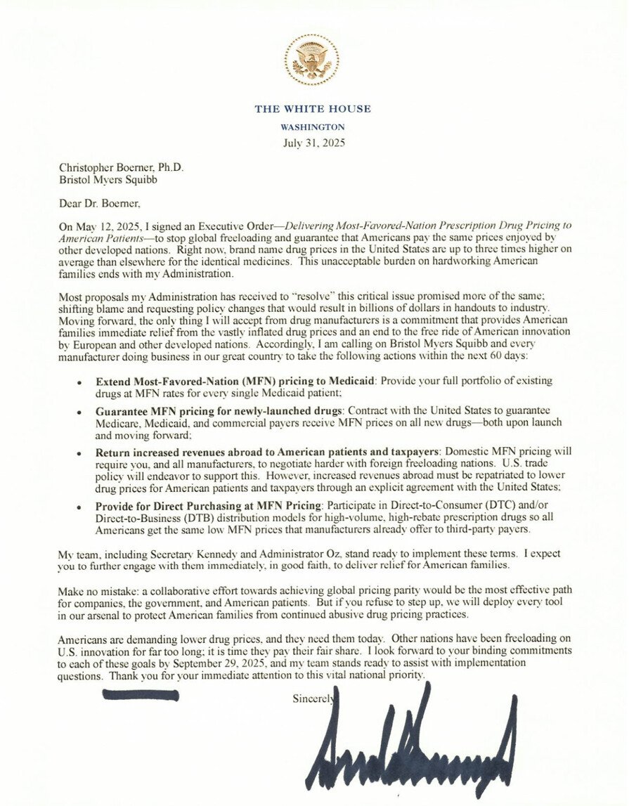 他的本意是是那些药品给美国价格比给其他国家价格高几倍,要求那些医药公司降下来保持一样,所以就是降了几倍(300%啥的)