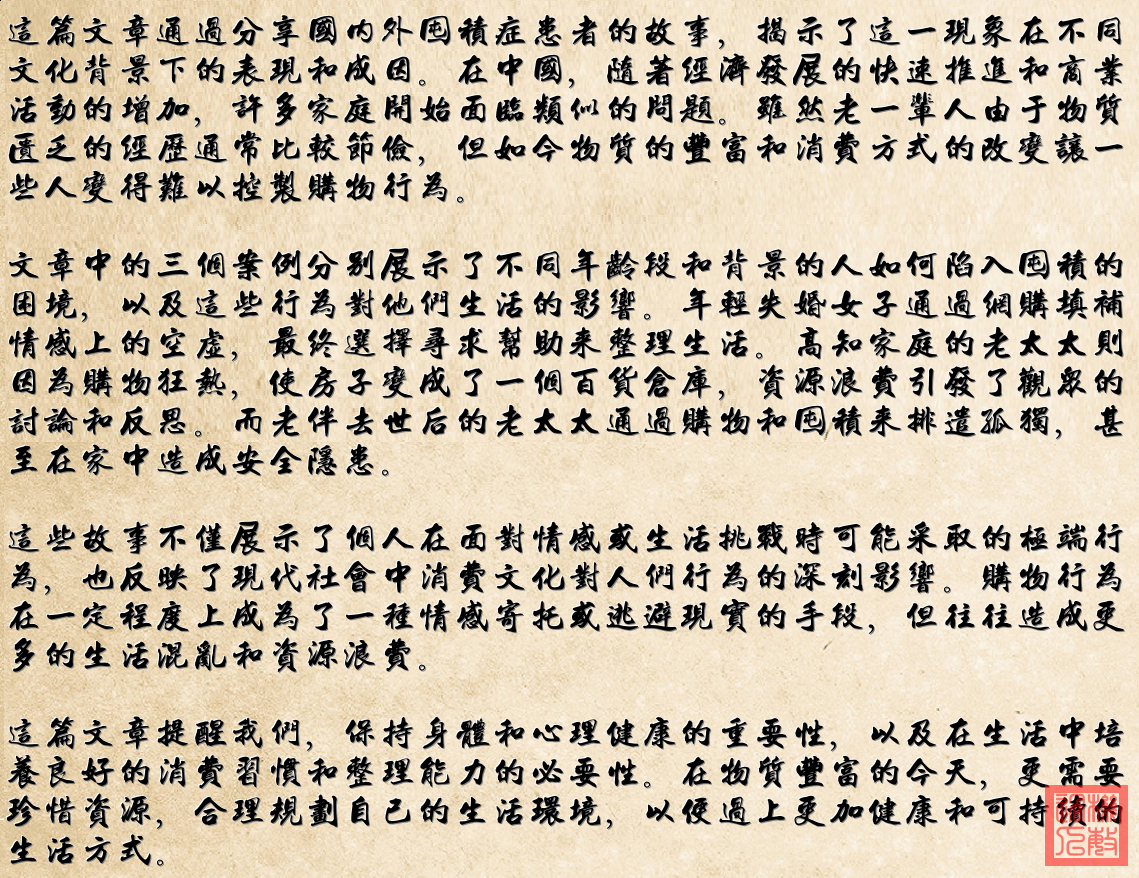 《满屋的空》 白昼被快递盒切割成方格 夜晚在购物车反复颠簸 他们说这是病 得治 我说这是填补 无底的空格 旧报纸裹着未拆的春天 保健品堆成彩色山脉 新鞋子在黑暗里列队 等一双永远不来的脚 (副歌) 满屋的崭新 满屋的灰尘 满屋的未拆封的清晨 我们囤积着 囤积着 把寂寞包装成商品 把岁月折叠成纸箱 把爱压缩成快递单上 一个模糊的地址 第二幕是知识分子客厅 精装书与过期药片共生 女儿说妈妈我们谈谈 老太太转身又下单十斤红枣 她说打折呢 多划算 像在说服某个看不见的深渊 (副歌) 满屋的崭新 满屋的灰尘 满屋的未拆封的清晨 我们囤积着 囤积着 把寂寞包装成商品 把岁月折叠成纸箱 把爱压缩成快递单上 一个模糊的地址 蟑螂在护照封皮散步时 老照片从布袋滑落 镜头突然摇晃 博主轻声说 “小心别扔了回忆” 而收废品的大哥抽着烟 看一车未拆封的四季 他说会送到需要的地方 这话轻得像句谎言 (尾声) 当清空的房间响起回声 当阳光第一次照到地板 我们终于听见 那个被掩埋多年的 微弱的 求救的信号 原来不是想要拥有更多 只是害怕失去 连灰尘都失去