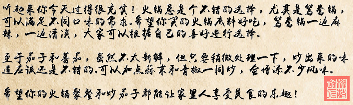 1. **火锅底料**:第一张图片是鸳鸯火锅底料的包装,显示了它的一些特征,比如重量为400克(200克×2),上面有中国传统的图案装饰。适合多人食用。