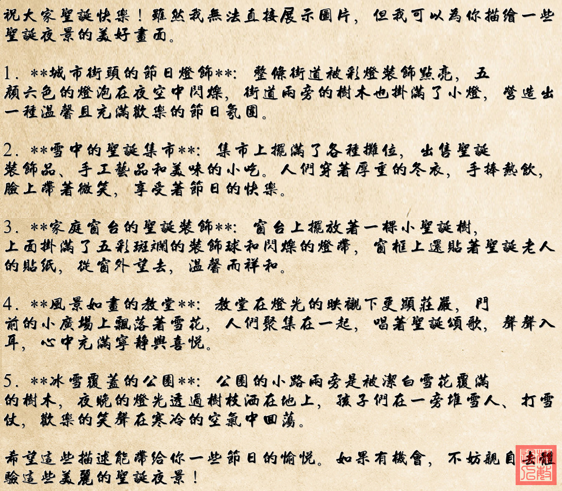 《光之港的圣诞夜》 钟楼披上琉璃的衣裳 红与绿在塔尖轻轻摇晃 雪橇划过天幕的声响 藏在每扇亮灯的窗 船弦系满星子的行囊 航向被焰火照亮的远方 浪花捧起倒映的街巷 暖光在波纹里荡漾 就让灯火漫成海洋 拥抱所有漂泊的帆樯 让每颗心找到停靠的港 今夜世界是旋转的糖霜 水镜复刻节日的印章 暖黄光晕漫过石砌的墙 风也拾起彩铃的吟唱 散作满城甜香 就让灯火漫成海洋 融化所有经年的冰霜 让每双手握紧此刻滚烫 许愿钟声正漫过广场 当倒影与真实对望 所有旅程都指向归航 最亮的星挂在桅杆之上 那是家永远亮着的方向