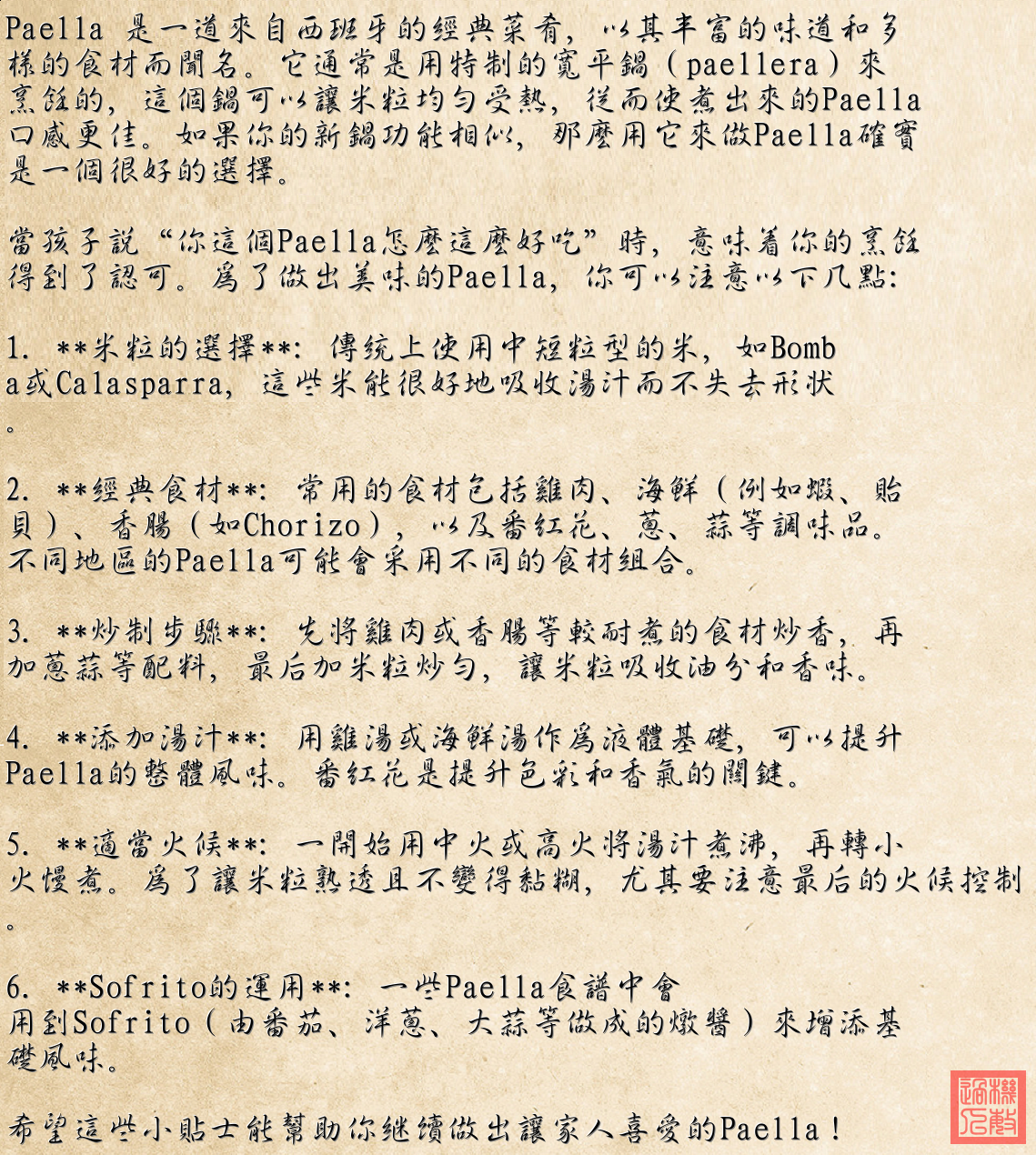 《锅中的海风》 铁铸的港湾盛满霞光 藏红花的金线织进米香 鱿鱼卷起浪 香肠漫游成岛屿 青红椒是碎落的夕阳 虾兵蟹将在蒸汽里列队 蛤蜊突然张开银白的嘴 贻贝含着珍珠 在饭粒间沉睡 锅沿结出焦香的年岁 你说这味道像潮汐涌进窗口 铁锅记得每粒米的漂流 藏红花把落日酿成酒 海的味道在舌尖停留 你说这锅子像童话里的宝藏 炖煮着整个地中海的晴朗 当木勺搅动星月的浆 最鲜的甜藏在锅底轻轻响 最后装盘时听见海鸥在飞 原来家的港湾不用船桅 当你说出那句赞叹的魔法 所有海浪都在盘子里轻轻回响