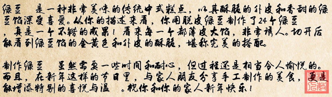 《绿豆椪的团圆》 芝麻撒成星光点点 烤盘上摆满金色月圆 二十四枚思念 在除夕夜轻轻蔓延 切开薄薄的酥皮岁月 露出甜甜的旧日时间 馅料裹着叮咛 是妈妈手心的温暖 新年钟声里炊烟软软 面粉沾满幸福的指尖 每个褶皱都藏着 说不完的岁岁年年 烤箱传来故乡的呼唤 满屋香气把思念填满 绿豆沙里尝到的 是团圆最美的语言