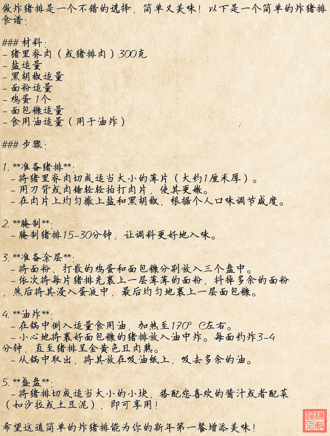 这是一个简单而温馨的场景,很适合作为新年第一餐,让人感受到家的温暖与庆祝的气氛。在新年之际,做一道简单的炸猪排,可以为新一年的开始增添美味和仪式感。
