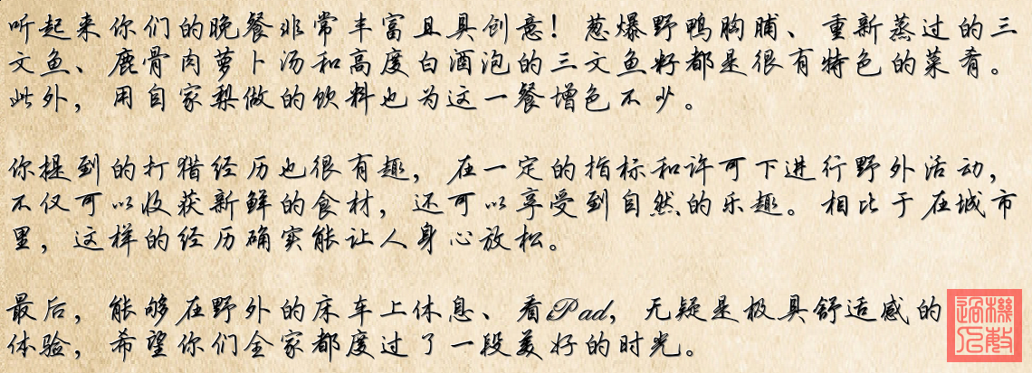 1. **晚餐图片**:这张图展示了一桌丰盛的晚餐,包括葱爆野鸭肉、蒸三文鱼、鹿骨萝卜汤、高度白酒泡的三文鱼籽、馒头和自制梨饮料。这些食物似乎都是通过打猎或自制获得的。