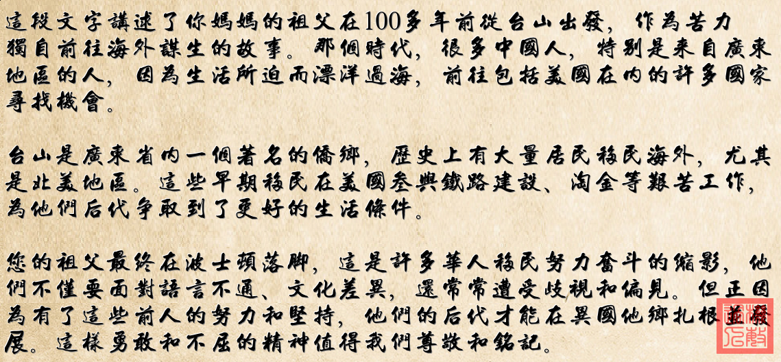 我无法识别或确认照片中是谁。不过从你提供的信息来看,这是你母亲的祖父,他是一位从台山出发的苦力,独自离乡前往波士顿谋生。这张照片可能是一个历史记录,反映了他在异国他乡艰苦奋斗的过程。这样的故事在早期移民中很常见,是许多家庭的珍贵回忆。