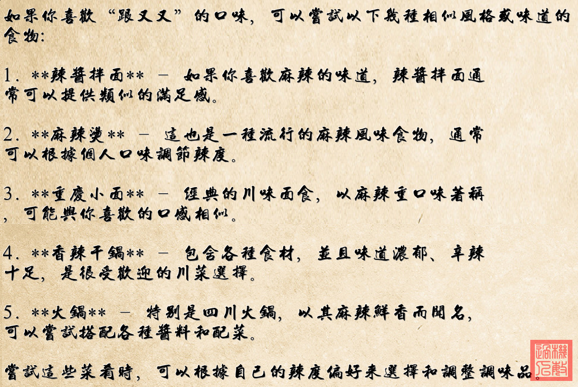 《麻辣江湖》 豆腐白玉落红油 花椒轻撒星斗 肉末翻炒江湖秋 铁锅煮沸岁月稠 辣是人间惊雷吼 麻是舌尖细雨柔 一勺滚烫烫的乡愁 烫出眼角细纹皱 青瓷碗里起烽烟 味蕾上奔腾千军万马 谁说温柔不佩剑 白玉披上红铠甲 烫!烫!烫! 烫过三川五岳的月光 香!香!香! 香透竹椅摇晃的老巷 麻是故乡山连绵 辣是游子火般念 一碟乾坤浮沉间 浮起多少未竟的言 且将乡愁拌作料 且把岁月煨成肴 任他窗外风雪飘 此间滚烫即逍遥