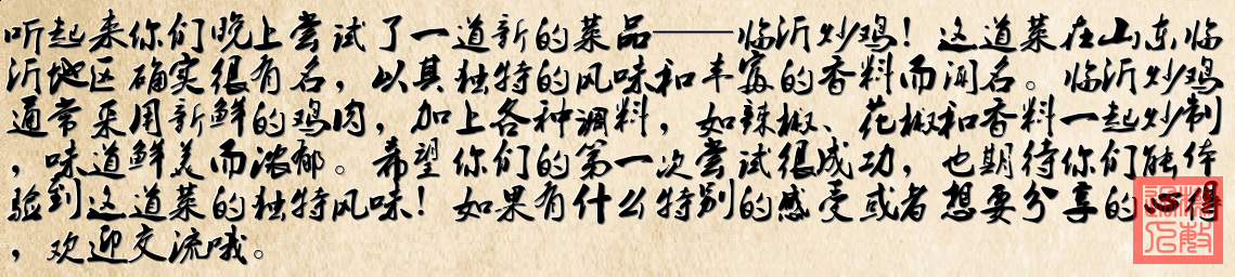 这些菜品看起来色香味俱全,组成了丰富的一餐。特别是临沂炒鸡,是一种地方特色菜,听说非常有名,看起来很美味。