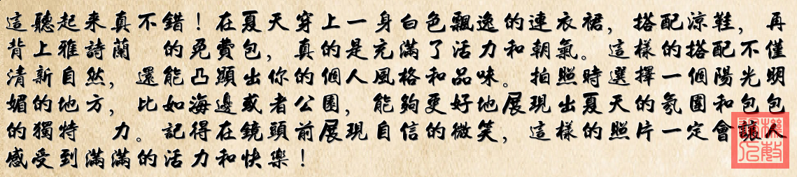这样的设计让人感觉青春洋溢,非常适合搭配夏季服装,比如白色飘逸连衣裙和凉鞋。整款包包给人阳光、活泼、时尚的印象,也突显出一种热爱生活、享受阳光的态度。