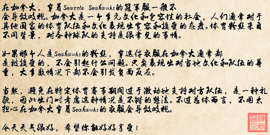 回答: 某人穿着Seahawks Championship 的衣服万里阳光照2026-02-14 15:18:22