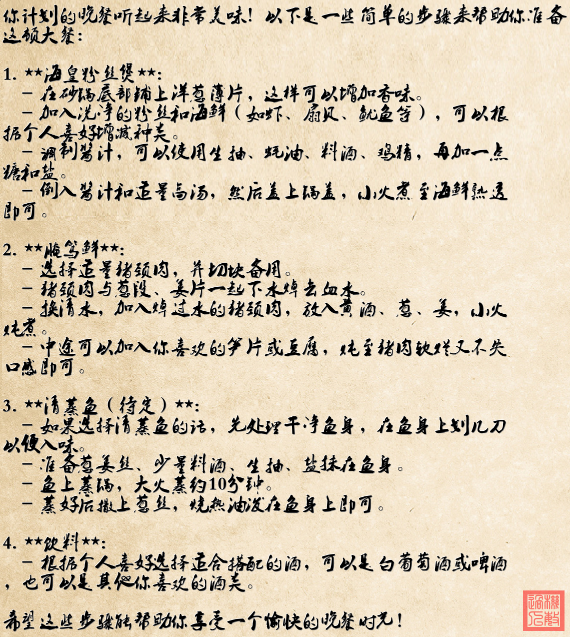 这些菜品搭配得当,可作为一次丰富的晚餐选择。