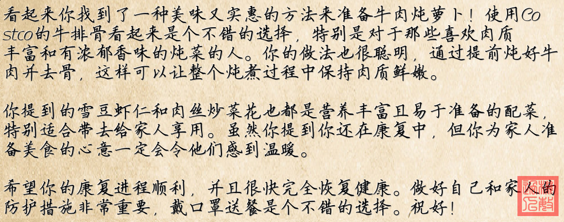 描述中提到,这些菜品是为作者的儿子家准备的,因为作者担心自己的健康问题,选择在家做好菜后送过去。同时作者对Costco的牛排骨表示满意,认为价廉物美。
