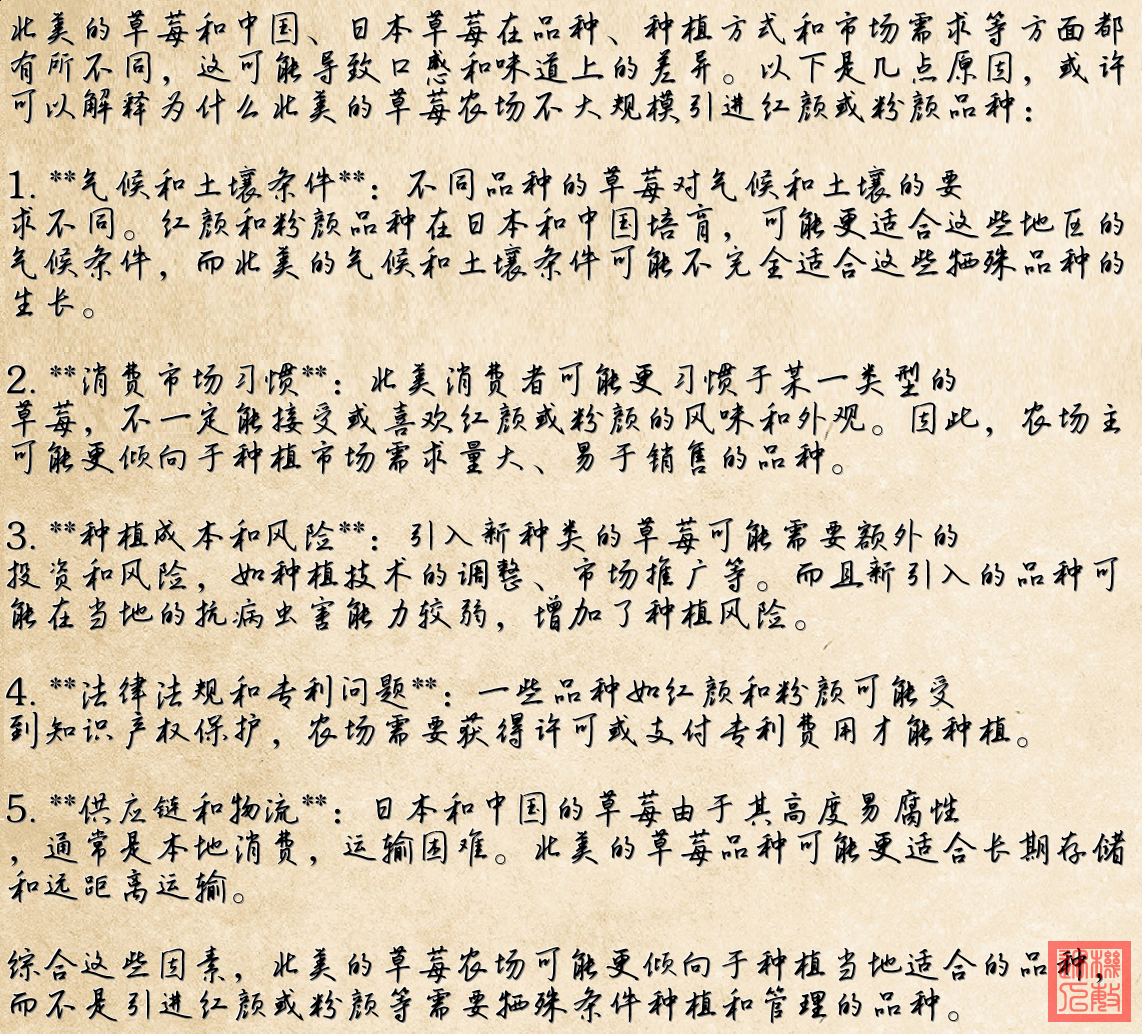 1. **气候条件**:不同品种对环境的要求不同,日本草莓可能需要特定的生长条件,而这些条件在北美并不容易实现。