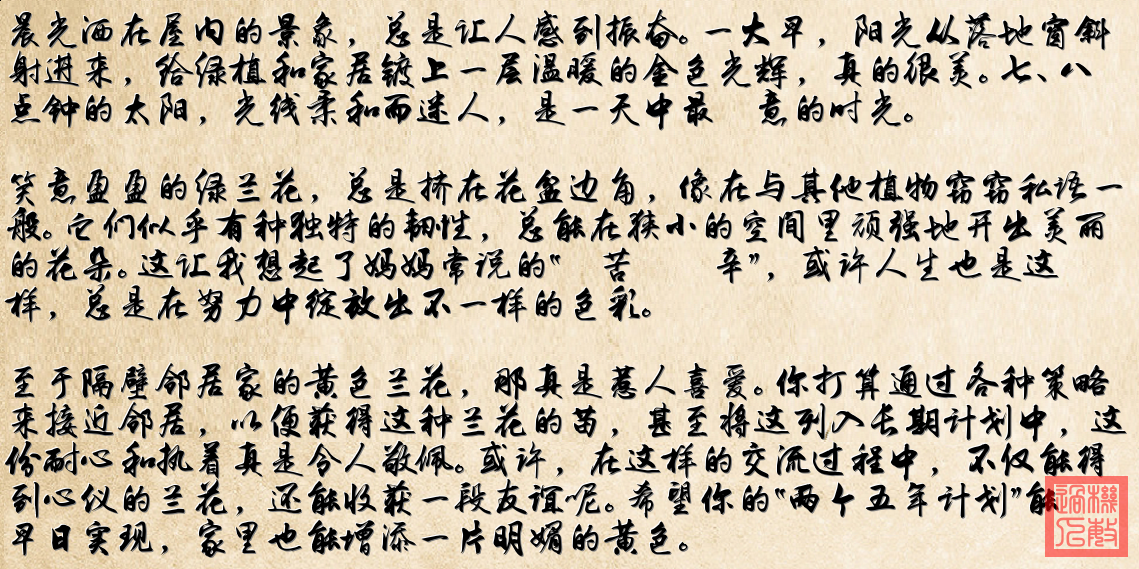 2. **黄色兰花的特写**:图中展示了一盆黄色兰花,阳光下显得生机勃勃。