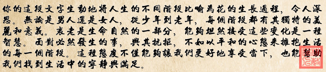 ## 《花事》 少年时总爱数枝头, 数着数着就数到春后。 青春是半开未开的酒, 醉倒整个巷口。 中年时看花不抬头, 只顾着肩上的秋。 花瓣落在风里头, 说岁月是条不归舟。 老年时推窗看云走, 看花影爬上旧衣袖。 香气淡得像句问候, 轻轻绕过空枝头。 男人啊一生像场花事, 从含苞到垂首。 开过就足够, 何必问多久。 开过就足够, 何必问多久。