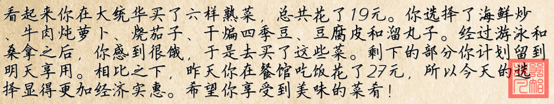 这些图片共同体现了在家制作餐食与外出就餐之间的成本差异。在大统华购买熟菜的成本明显较低,仅花费19元,而在餐馆就餐则花费27元。