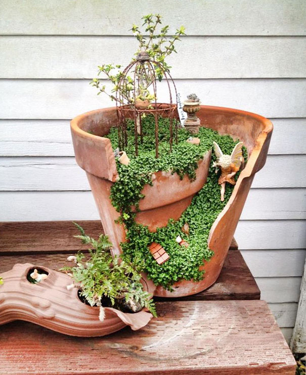 “砰”,罐子摔碎了。不要紧,创意园艺的新趋势是用破碎一边罐子做成精致的迷你花园,这种做法颇有些化腐朽为神奇的意味。破罐子破掉了,仍然有它的大用处哦。
