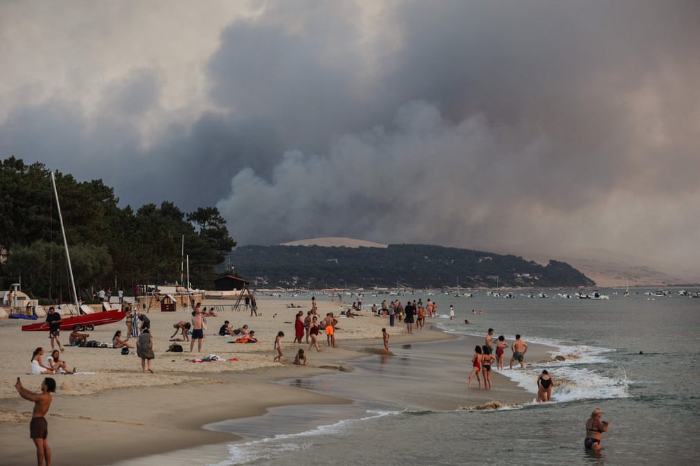 People swim on the Moulleau’s beach as smoke rises from a forest fire in La Teste-de Buch. Meteorologists have warned of a ‘heat apocalypse’ in western France as more than 8,500 people fled their homes to escape a large wildfire sparked by a searing southern European heatwave that has already caused hundreds of deaths Photograph: Thibaud Moritz/AFP/Getty Images