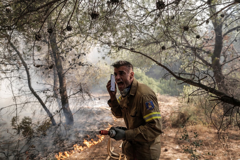 Firefighter Panagiotis Haratsis tackles a wildfire in the north-east suburb of Pallini near Athens. Raging wildfires continued to burn this week in Athens, with firefighters engaged in a desperate battle to control flames that were fanned by gale-force winds. Firefighters in Portugal, Spain, France, Greece and Morocco were battling forest fires raging across tens of thousands of hectares as this week’s heatwave continued to bring extreme temperatures and cause hundreds of deaths across south-western Europe Photograph: Kostas Tsironis/EPA