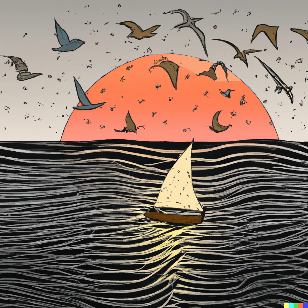 A hand-drawn sailboat circled by birds on the sea at sunrise